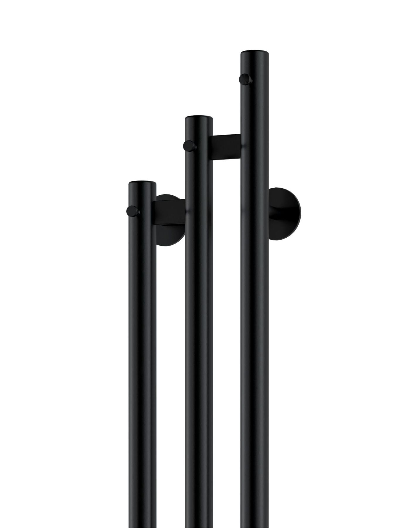 Матовое покрытие с легкой песочной текстурой исключает следы от отпечатков пальцев, а черный цвет создаёт эффектный контраст и идеально сочетается с остальной сантехникой темных оттенков. Крючки на полотенцесушителе предусмотрены для дополнительного размещения текстильных изделий.