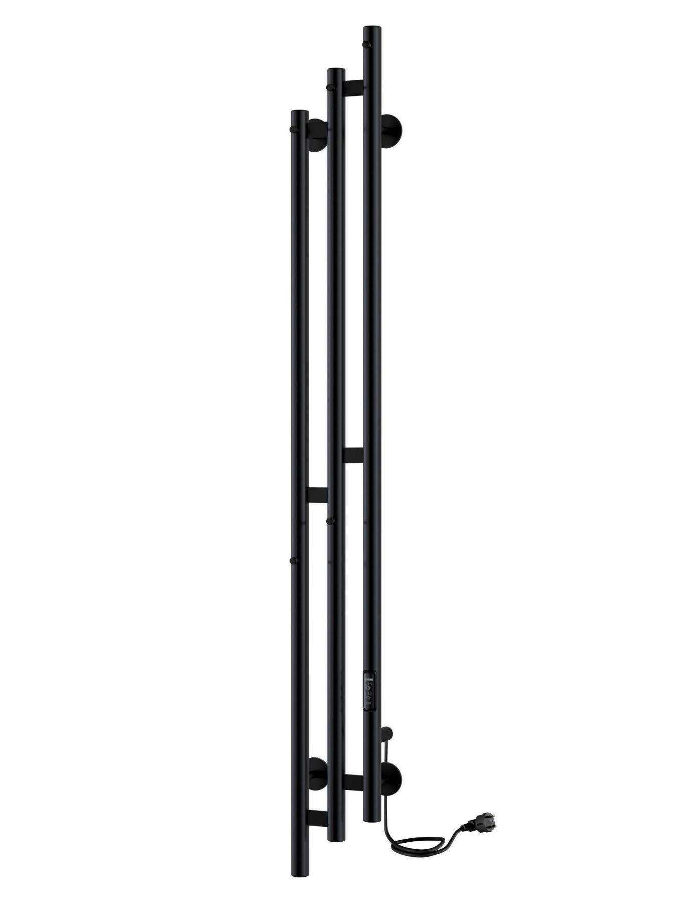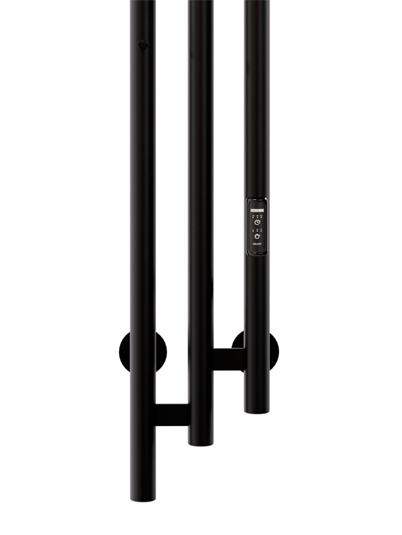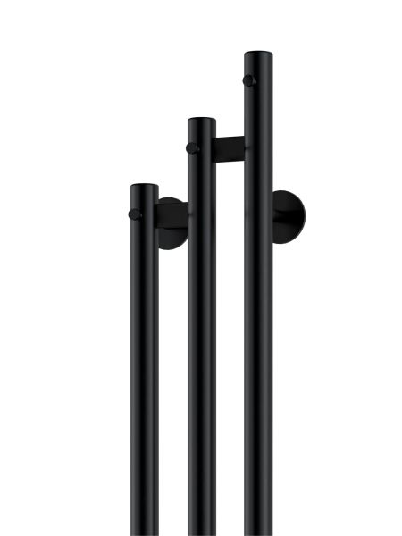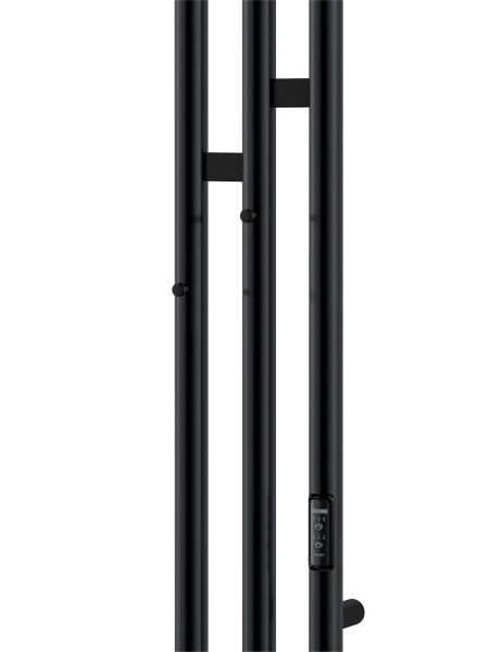 Электрический полотенцесушитель INDIGO Sky в цвете «Черный Муар». Уникальный дизайн, состоящий из трех круглых вертикальных стоек диаметром 32 мм, асимметрично соединенных прямоугольными перекладинами, придаст вашей ванной комнате современный вид.  Полотенцесушитель черный матовый покрыт безопасным порошковым полимером, что делает его устойчивым к повреждениям и облегчает уход за ним.