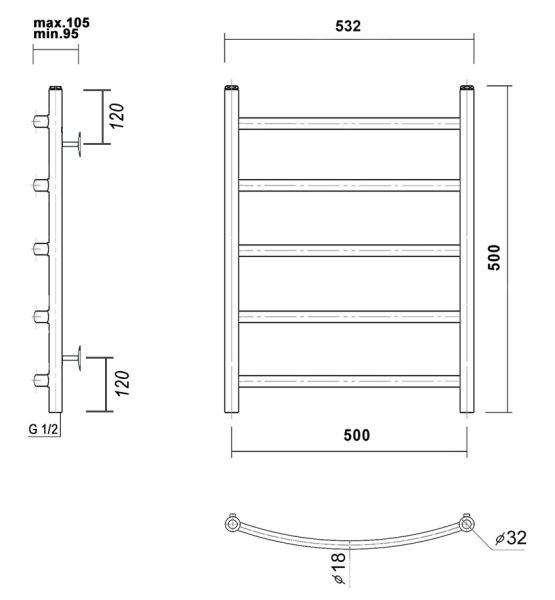 М/о расстояние (межосевое расстояние): 500Количество перекладин: 5Коллекция: КалипсоТип: водяныеЦвет: белыйШирина (мм): 532Высота (мм): 500Глубина (мм): 105-95Вес: 3,79Объем: 0,045Тэн/подключение: нижнееСтрана: РоссияГарантия: 5 лет