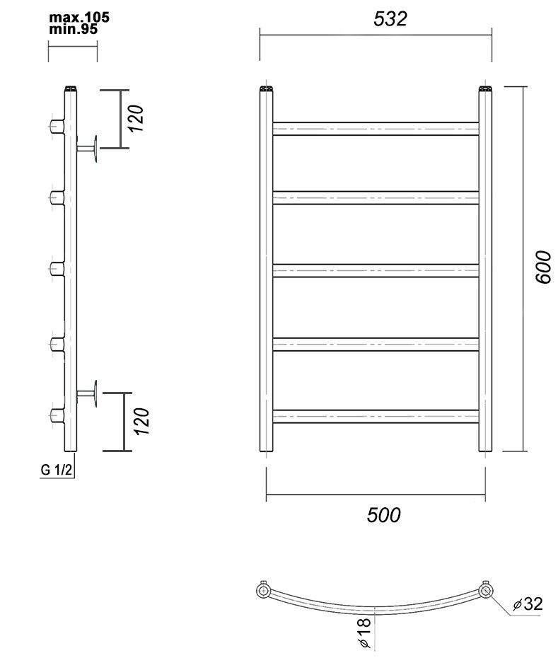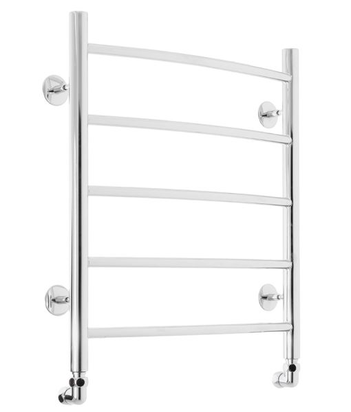 Полотенцесушитель водяной Domoterm Калипсо П5 ширина 50 см, высота 60 см, нижнее подключение, хром, Калипсо П5 500x600Водяной полотенцесушитель из нержавеющей пищевой стали. Цвет «хром» – полированная до зеркального блеска нержавеющая сталь. Труба электросварная. Толщина 2 мм. Вертикальные стойки имеют диаметр 32 мм., горизонтальные перекладины выполнены из трубы диаметром 18 мм. Подключение к ГВС нижнее, резьба внутренняя, 1/2"