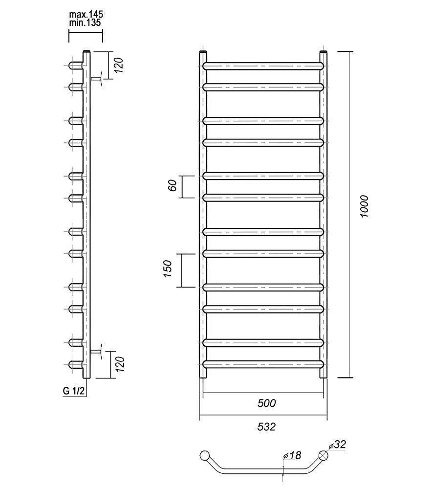 М/о расстояние (межосевое расстояние): 500Количество перекладин: 12Коллекция: ЛаураТип: водяныеЦвет: хромШирина (мм): 532Высота (мм): 1000Глубина (мм): 145-135Вес: 8.23Объем: 0.091Страна: РоссияГарантия: 10 лет