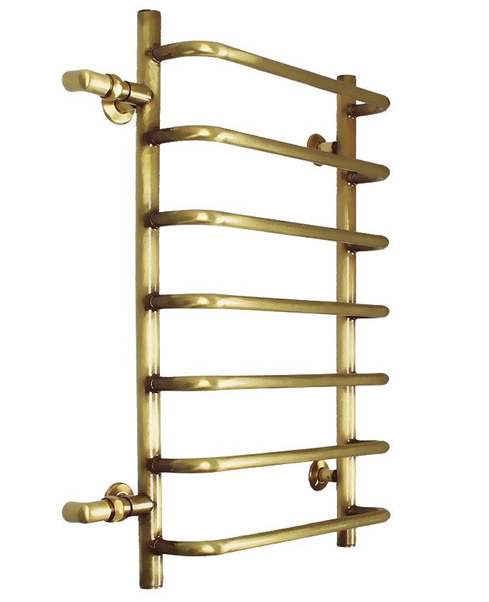 Стильный водяной полотенцесушитель Domoterm (Домотерм) Стефано п7 400x700 АБР (500) Может использоваться во всех трёх системах: горячего водоснабжения, центрального отопления и в закрытой отопительной системе. Выполнен из качественной и прочной латуни, имеет боковое подключение и прекрасно монтируется на стене в ванной комнате. На семи выпуклых перекладинах вместиться приличное количество полотенец или текстиля для быстрой сушки.Особенности и преимущества: