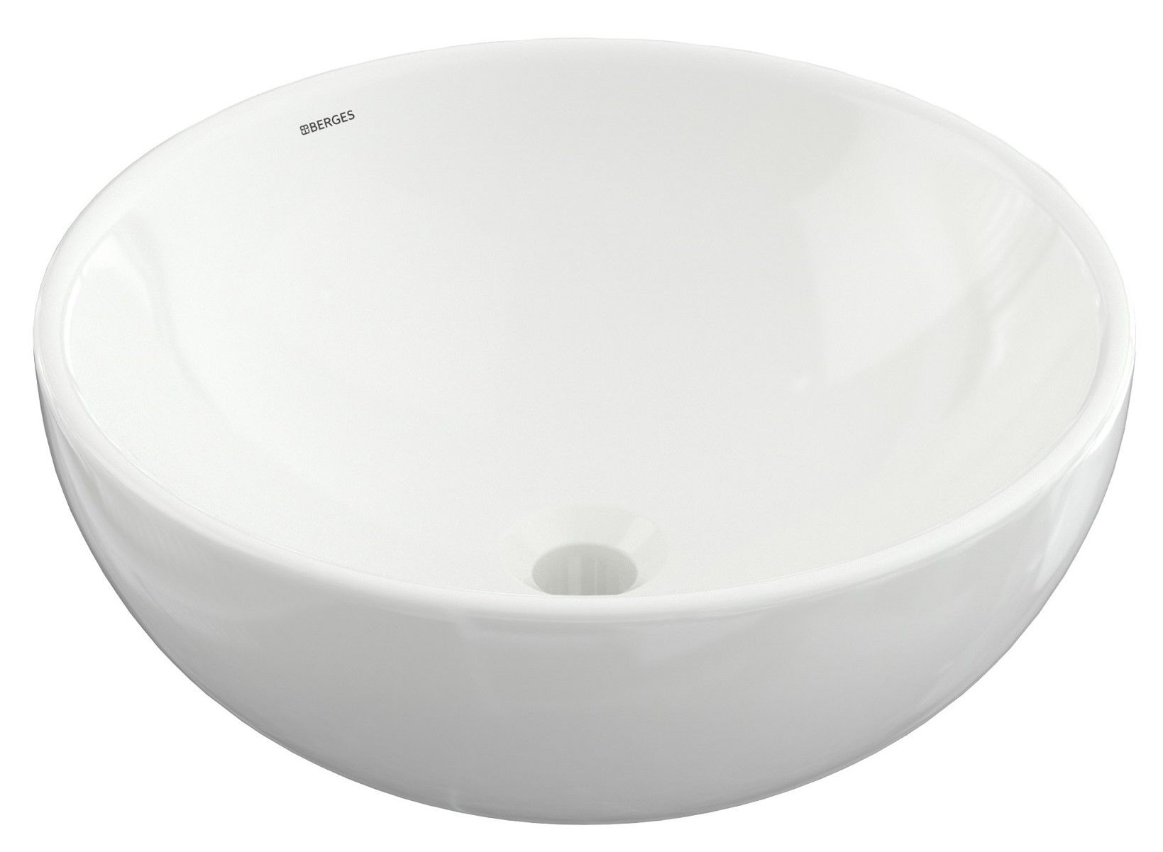 Накладная раковина из санфарфора Berges Mascon диаметром 45 см. Высота 17,5 см. Круглой формы, без отверстия под смеситель, глянцевая белая.