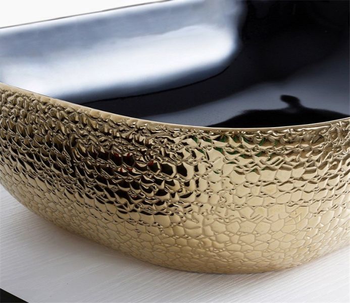 Раковина CeramaLux D1333H022 черно-золотая 46 смПодходит для ванных комнат различной планировки в современном стиле и отличается стильной и изящной формой.Материал: санфаянс.В комплекте поставки: раковина.