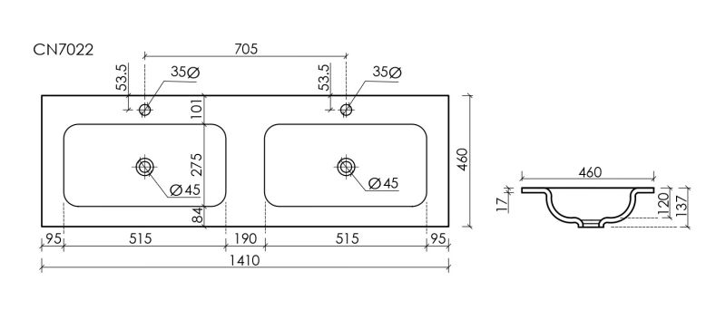 • Коллекция Grace. Размер 1410x457x137 мм, с двумя чашами и отверстиями под смеситель.