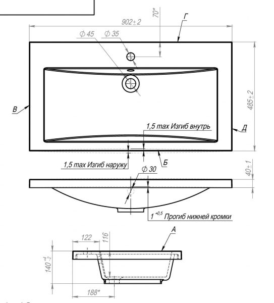 - Диаметр отверстия под смеситель: 35 мм