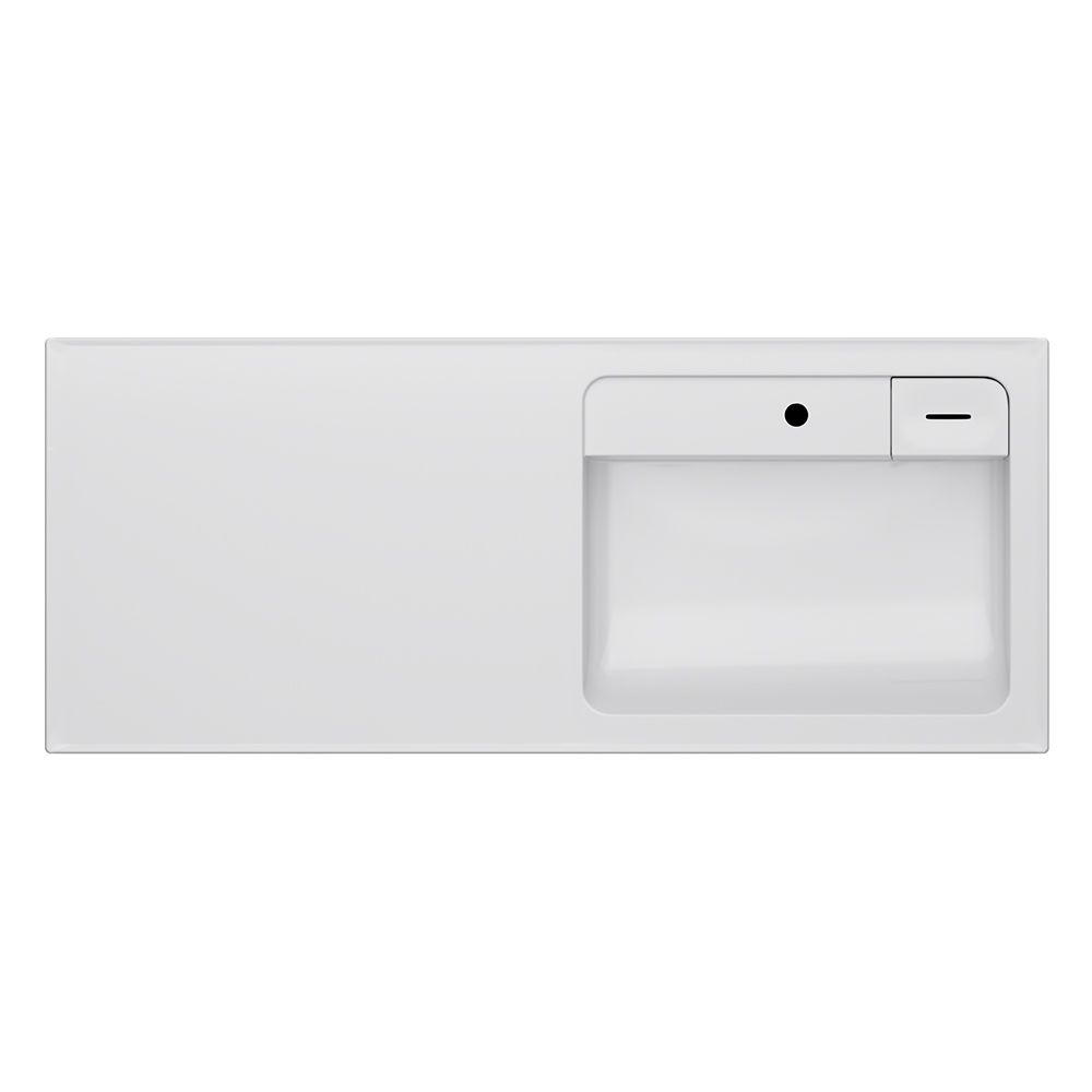 Дизайнерская раковина из литьевого мрамора белоснежного цвета с бортиком, скрытым сливом и съемной мыльницей. Раковина оснащена просторной столешницей, на которой можно разместить косметические и гигиенические средства. Столешница защищает стиральную машину от повреждений и механических воздействий.