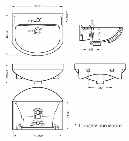 Размеры умывальника: 561 х 463 х 219