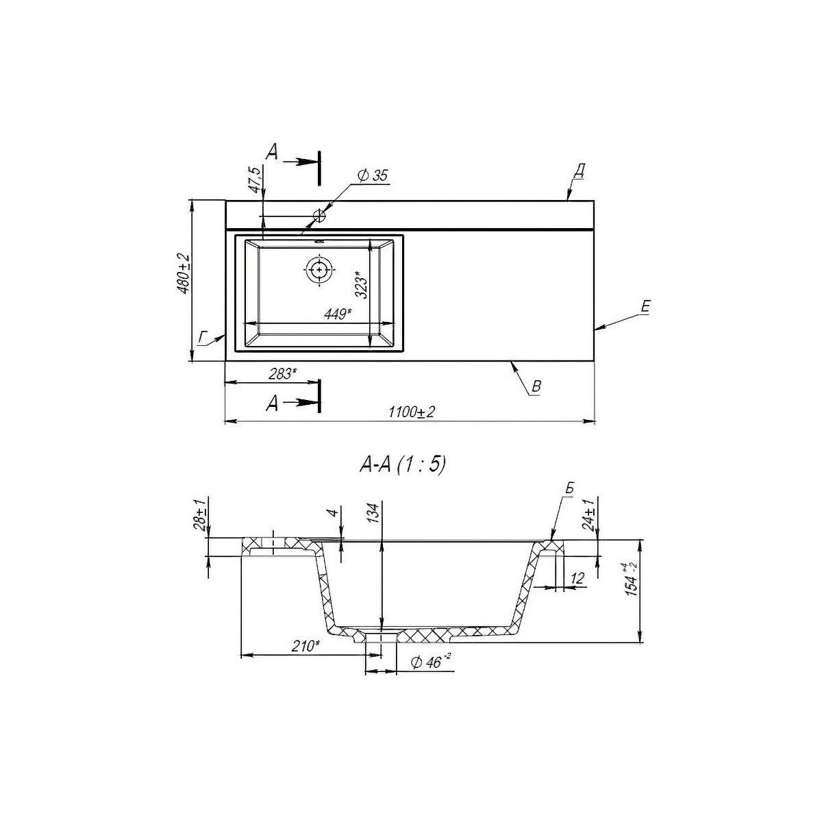 • Намеченные отверстия под смеситель: