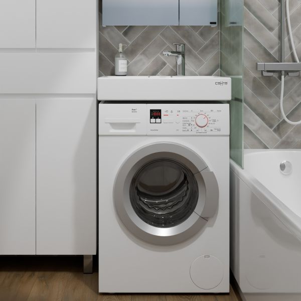 Раковина установленная над стиральной машиной является одним из самых оптимальных способов экономии полезного пространства в ванной комнате. Установка раковин над стиральной машиной является актуальной для небольших квартир в современных новостройках, апартаментах, студиях. Огромным плюсом также является то, что нет необходимости делать дополнительные коммуникации. Слив воды расположен в задней части умывальника и расположение сифона не мешает установке стиральной машины. Таким образом, все коммуникации собраны в одном месте.