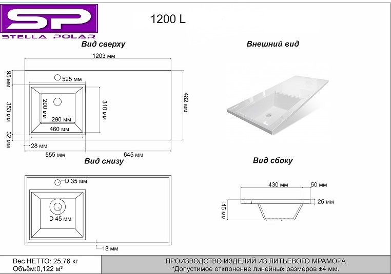 Раковина над стиральной машиной Stella Polar Мадлен 120см левая белый мрамор SP-00001071 купить