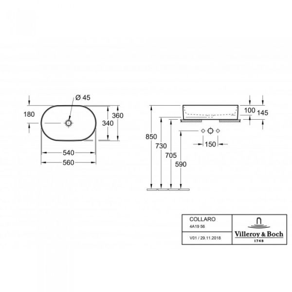 Раковина накладная Villeroy Boch Collaro 36 x 56 см 4A195601