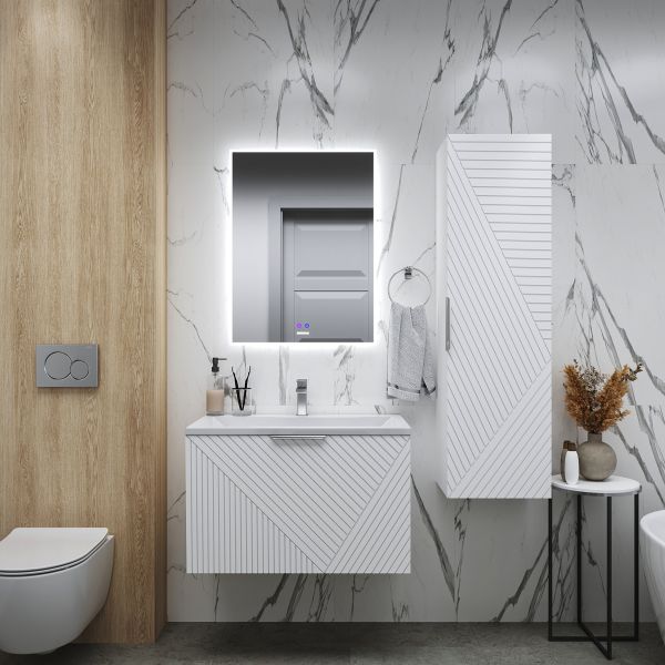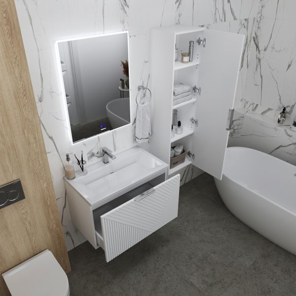 Корпус и фасады выполнены из влагостойкого МДФ, покрытого матовой краской. Это делает пенал прочным, устойчивым к влаге и безопасным для использования в условиях ванной комнаты.Размеры: