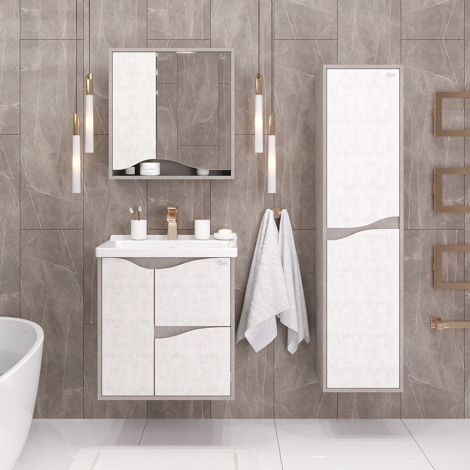 Зеркальный шкаф Onika БРЕНДОН 60 поможет создать особенную атмосферу ванной комнаты: текстуры камня и бетона гармонично дополняют друг-друга, создавая сдержанный выразительный акцент в интерьере.