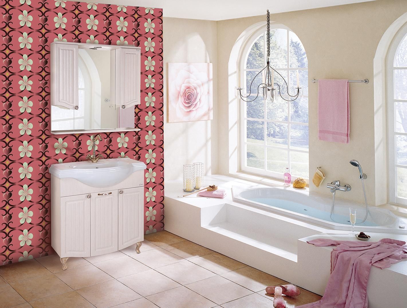 Изящный цвет белого дерева, лаконичная фрезеровка на фасаде и ручки цвета бронзы с эмалью - отличный вариант для оформления ванной комнаты в аристократичном классическом стиле.