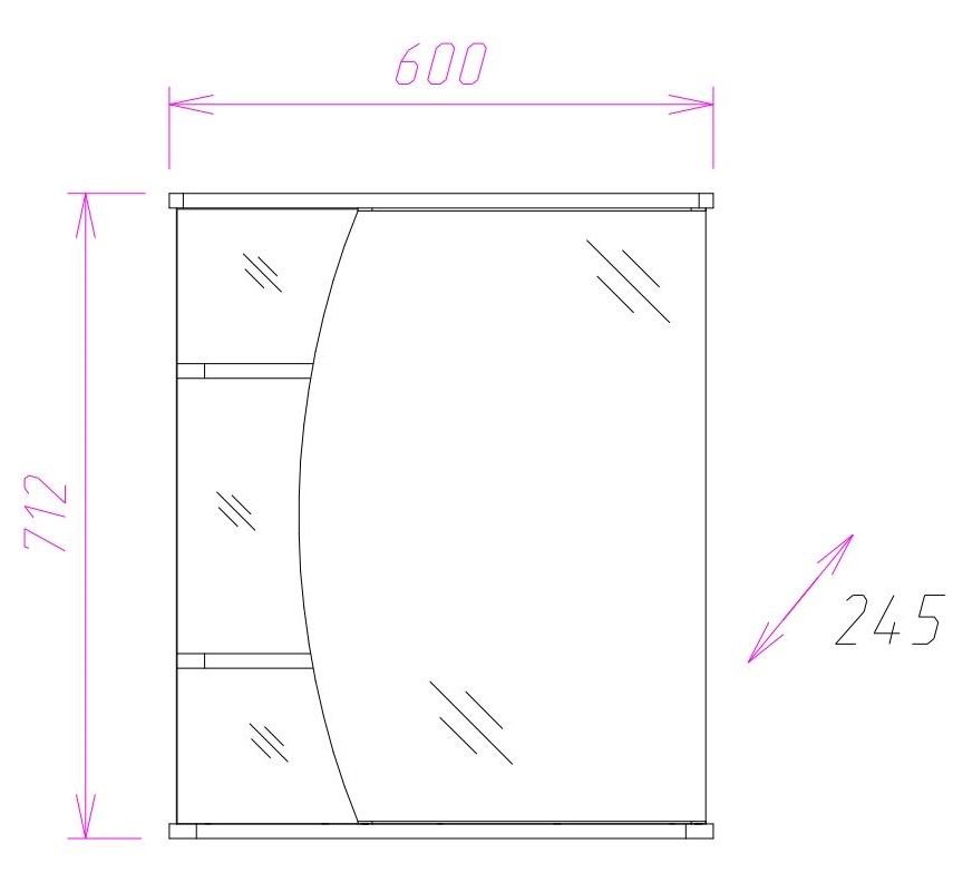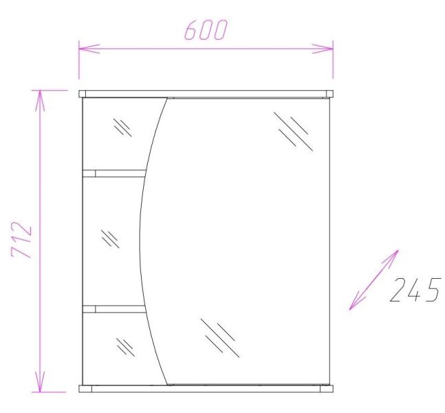 Слева за распашной зеркальной дверцей с механизмом плавного закрывания расположено вместительное отделение для хранения, справа - 3 открытые полочки для косметических средств или декоративных элементов.
