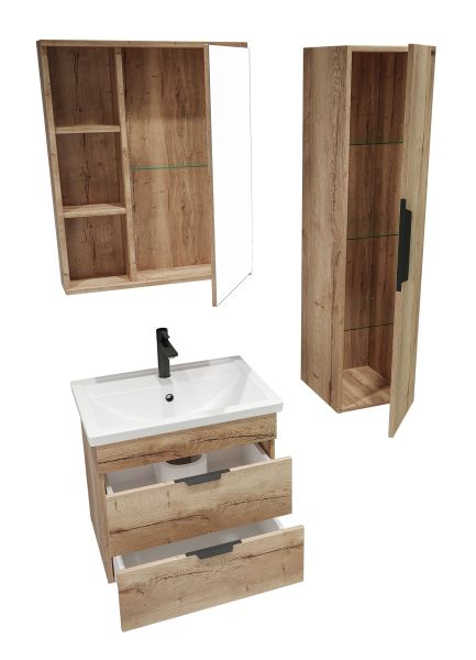 Корпус шкафа-зеркала выполнен из ЛДСП, фасад - из ЛДСП и ЛМДФ в пленке, устойчивых к механическим воздействиям, перепадам температур и высокой влажности.