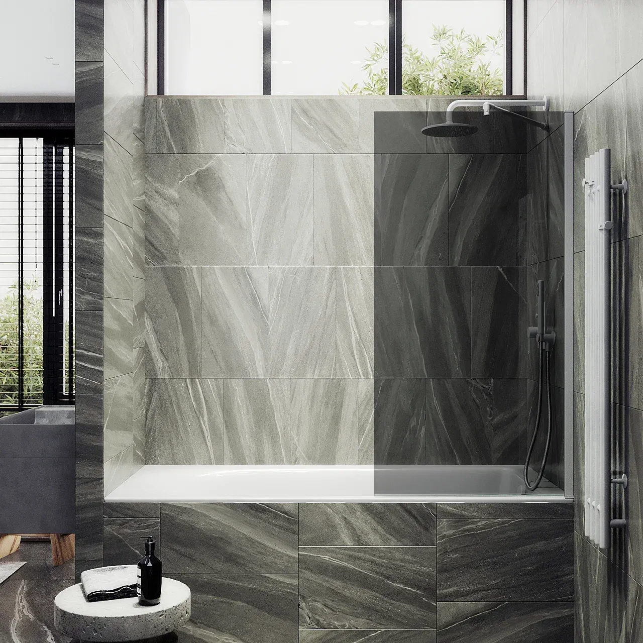Монтаж осуществляется с помощью алюминиевого профиля, что обеспечивает надежность крепления и безопасность использования стеклянной перегородки для ванной. Также, шторка оснащена специальным уплотнителем, который предотвращает попадание воды на пол ванной комнаты. Закаленное стекло, цвет Графит, толщина 8 мм 1400х800 мм - 1 шт.