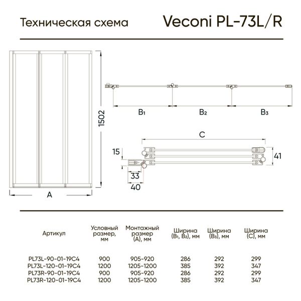 Шторка на ванну Veconi Palau PL-73R, 900x1500, хром, стекло прозрачное
