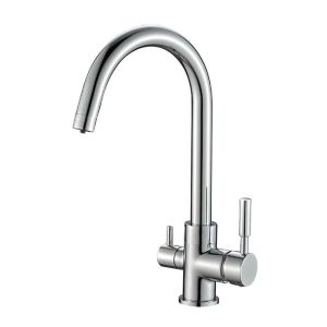 Смеситель для кухни Aquanika Comfort изготовлен из высококачественной латуни и оснащен поворотным изливом длиной 207 мм. Высота излива 255 мм. Излив смесителя является поворотным, а внутри него установлен излив для питьевой воды, поступающей через фильтр. Подача питьевой воды осуществляется по изолированному каналу и не соприкасается с обычной водопроводной водой. Включается подача питьевой воды отдельным рычагом (фильтр в комплект не входит). Смеситель совместим с любым стандартным фильтром.