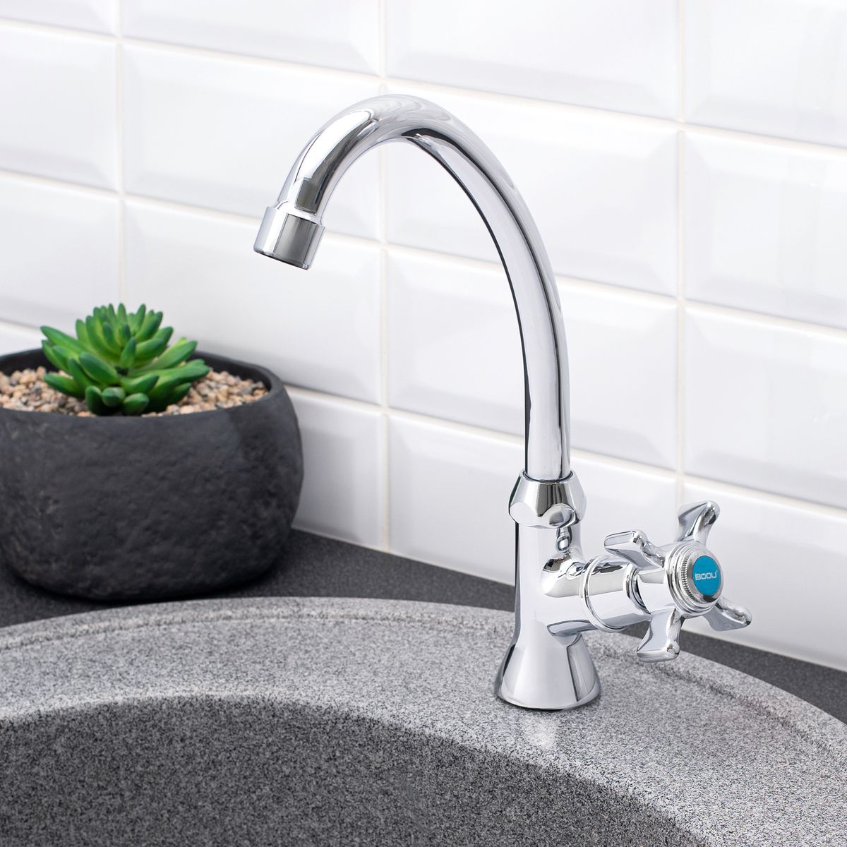 Смеситель для одной воды ТМ BOOU, предусматривает подключение только к холодной во-де. Имеет трубчатый излив в форме буквы J, удобен для наполнения высоких емкостей и мы-тья габаритной посуды.