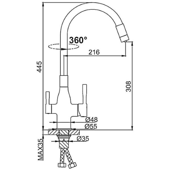 Излив:   поворотный, гибкий, с каналом для питьевой воды.