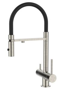Профессиональный смеситель для кухни Ace в сатиновом оттенке с черным гибким изливом и отдельным каналом для фильтрованной воды. Продуманный и функциональный, он успешно справляется с повседневными задачами на кухне.