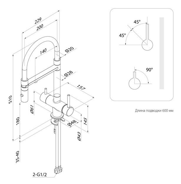 2 ручки: для включения фильтрованной воды и для обычной водопроводной (угол открывания ручки – 90 градусов, на себя; может отличаться в зависимости от партии). Фильтр в комплекте не идет и приобретается отдельно.