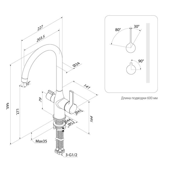 Продумано до мелочей: угол открывания ручки – 110 градусов (30 градусов от себя – холодная вода, 80 на себя – горячая). Позволяет комфортно пользоваться смесителем и удобно регулировать температуру и напор.