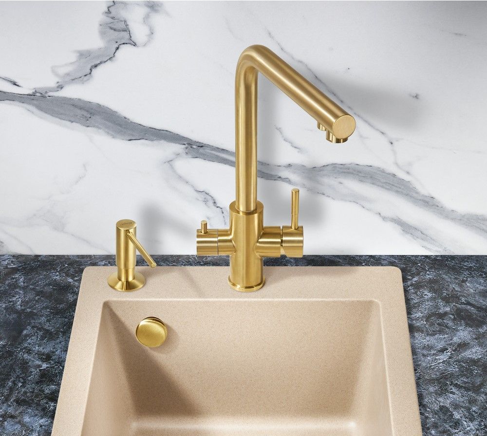 Смеситель для кухонной мойки Milacio Ultra (MCU.553.GD) из нержавеющей стали с PVD покрытием в цвете сатинированное золото, с возможностью подключения фильтра — стильное и инновационное решение для вашей кухни.