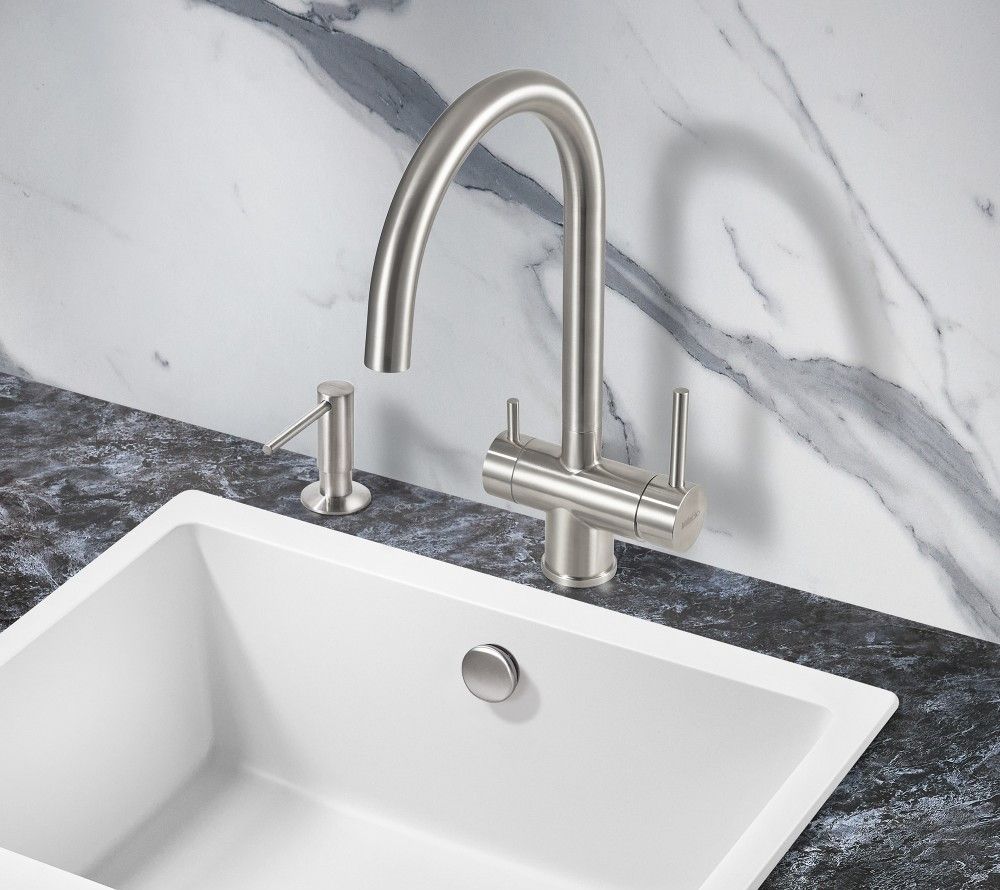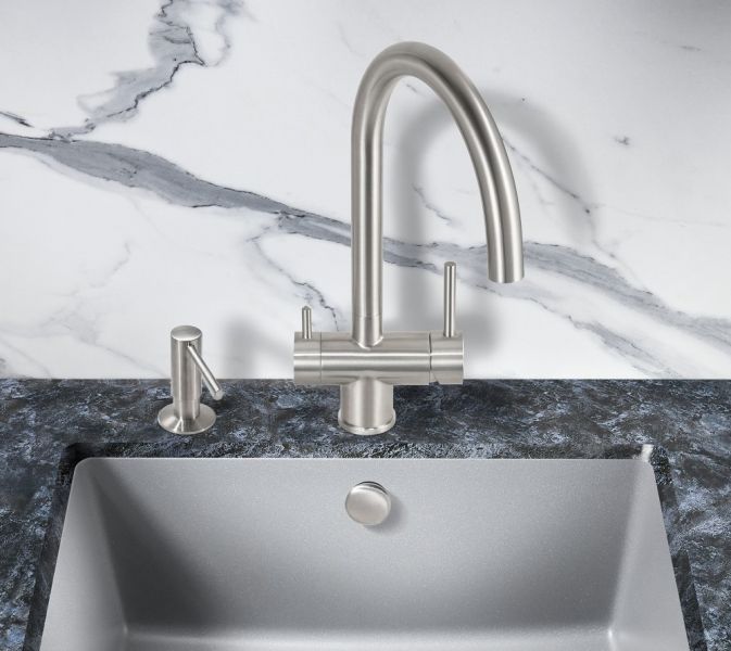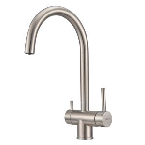 Модель выполнена в цвете серебристого металла (сатинированная нержавеющая сталь) и имеет изящный изогнутый кран, благодаря чему станет яркой, привлекающей внимание деталью на кухне и никого не оставит равнодушным.