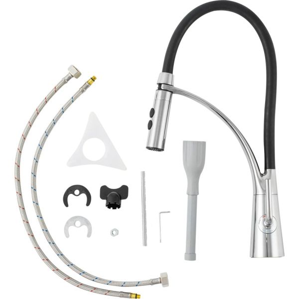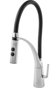 Высокий поворотный излив смесителя для кухни «ПАИНИ» позволяет менять направление потока воды, использовать глубокую посуду, а гибкая лейка удобна для того, чтобы набрать воду, помыть продукты и так далее.