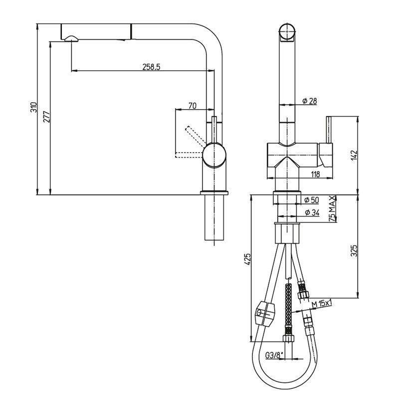• Выдвижная лейка с двумя режимами подачи воды.