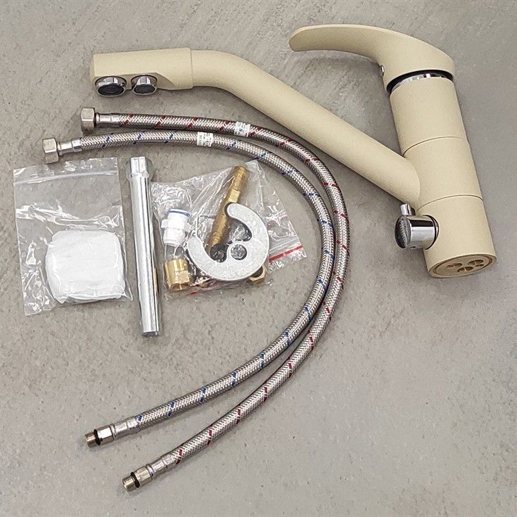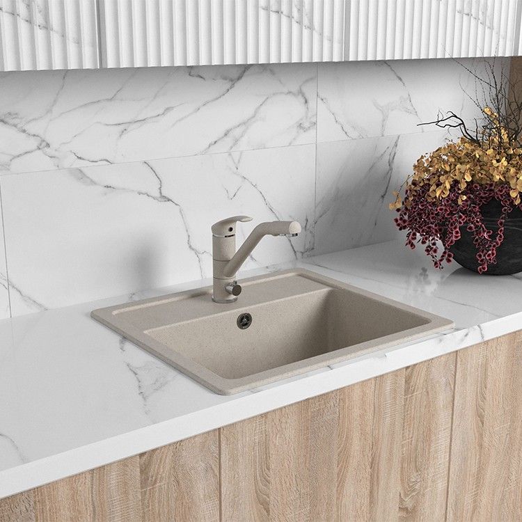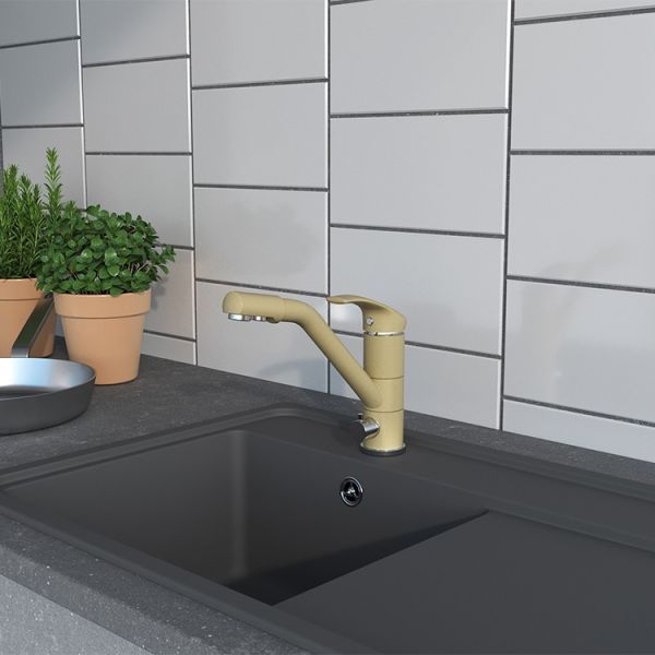• Корпус из латуни с покрытием бежевый гранит подходит для популярного цвета моек, удобен в уходе.