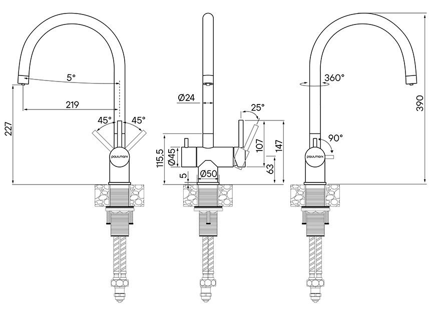 Смеситель для кухни, с возможностью подключения фильтра питьевой воды, артикул He213218-SSИзготовлен из нержавеющей стали AISI 304. Нержавеющая сталь AISI 304 легирована никелем, марганцем, медью и хромом, что обеспечивает ей повышенную прочность и устойчивость в коррозионных средах, такая сталь подвержена деформациям.
