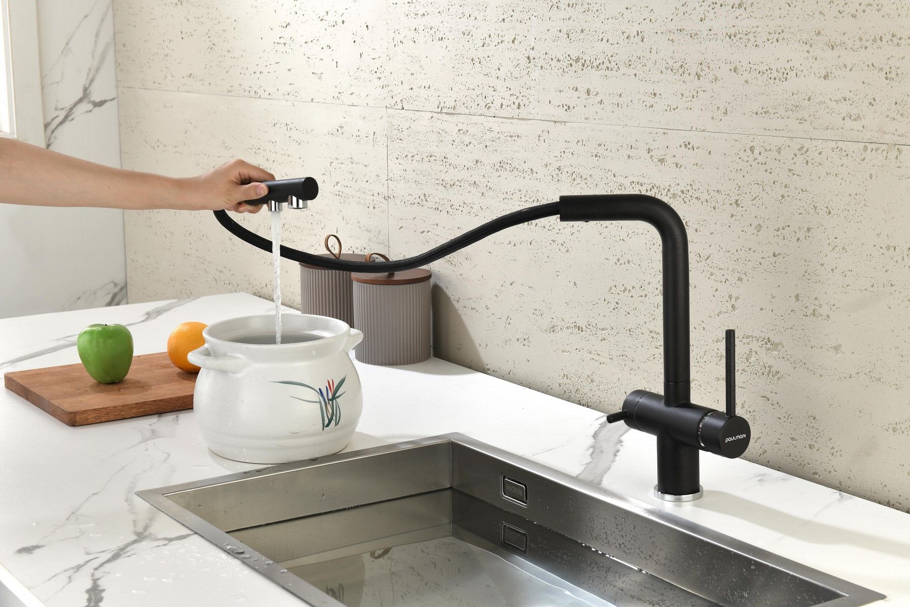 Смеситель оснащен гибким выдвижным изливом из нелойновой оплетки, которая обладает отличной устойчивостью к истиранию и разрушению. Данная техническая особенность расширяет рабочую зону смесителя, позволяя пользоваться им с удобством в больших мойках, мойках с двумя чашами, или наполнять водой ёмкость на столе рядом с мойкой, в том числе питьевой водой.
