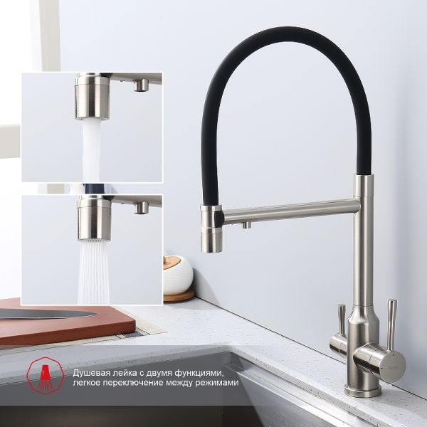 Смеситель для кухни со съемным изливом на магните и подключением фильтра питьевой воды, гибкий излив белого цвета. Крепление на усиленной гайке. Подводка длиной 55 см имеет латунные гайки. Гарантия на смеситель 7 лет и 2 года на покрытие!