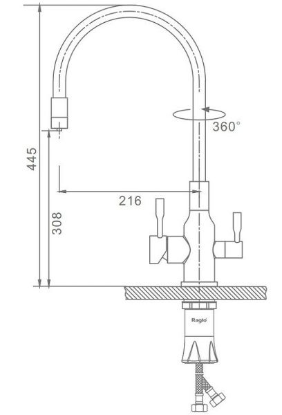Смеситель для кухни с подключением к фильтру питьевой воды. Гибкий излив белого цвета. Крепление на усиленной гайке. Подводка длиной 55 см имеет латунные гайки. Гарантия на смеситель 7 лет и 2 года на покрытие!