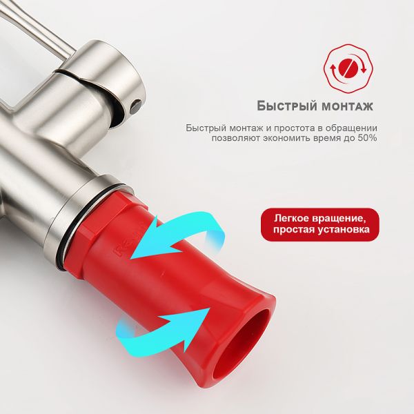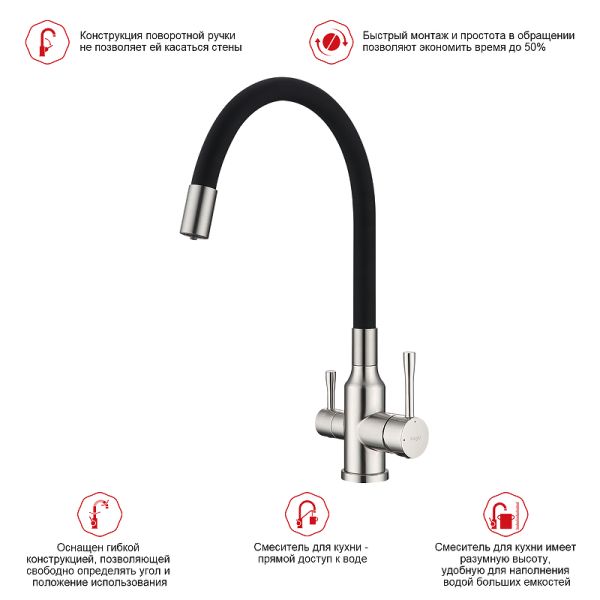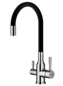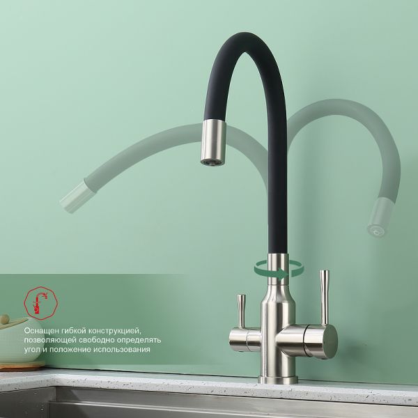 Смеситель для кухни с подключением к фильтру питьевой воды. Гибкий излив белого цвета. Крепление на усиленной гайке. Подводка длиной 55 см имеет латунные гайки. Гарантия на смеситель 7 лет и 2 года на покрытие!