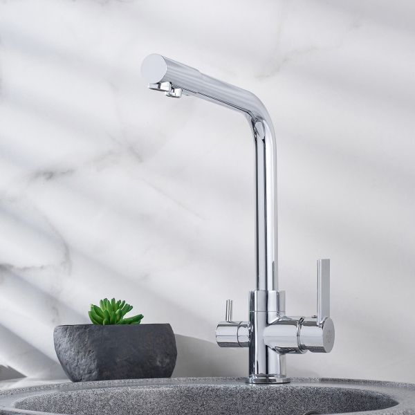 Стильный и лаконичный однорычажный смеситель для кухни с высоким поворотным изливом, прекрасно подойдёт для подключения фильтра питьевой воды благодаря дополнительному изливу и специальному переходнику.