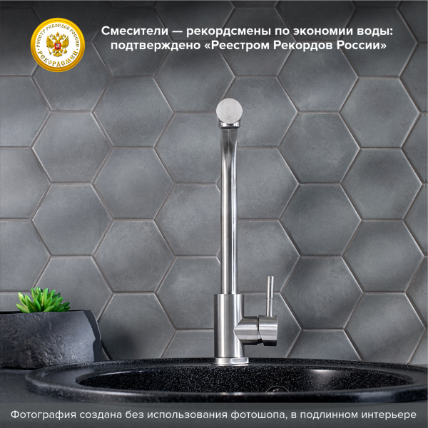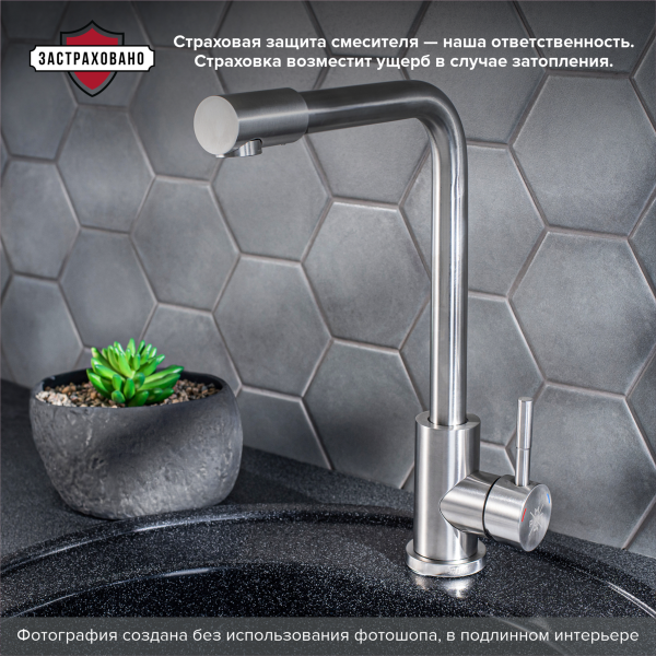 Одноручковый смеситель для кухни из нержавеющей стали с высоким изливом прекрасно подойдет для мойки любого размера, обладает наклонным аэратором.