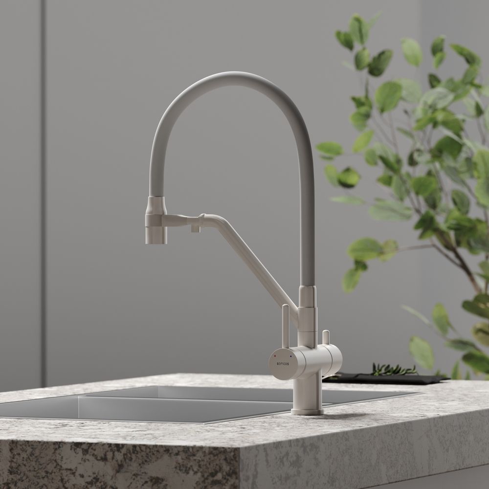 Смеситель для кухни SANCOS Dora с гибким изливом и возможностью подключения фильтра для воды, цвет матовый белый, арт. SC4003MWС возможностью регулировки температуры водыАэратор, гибкая подводка, ключ и крепления для монтажа
