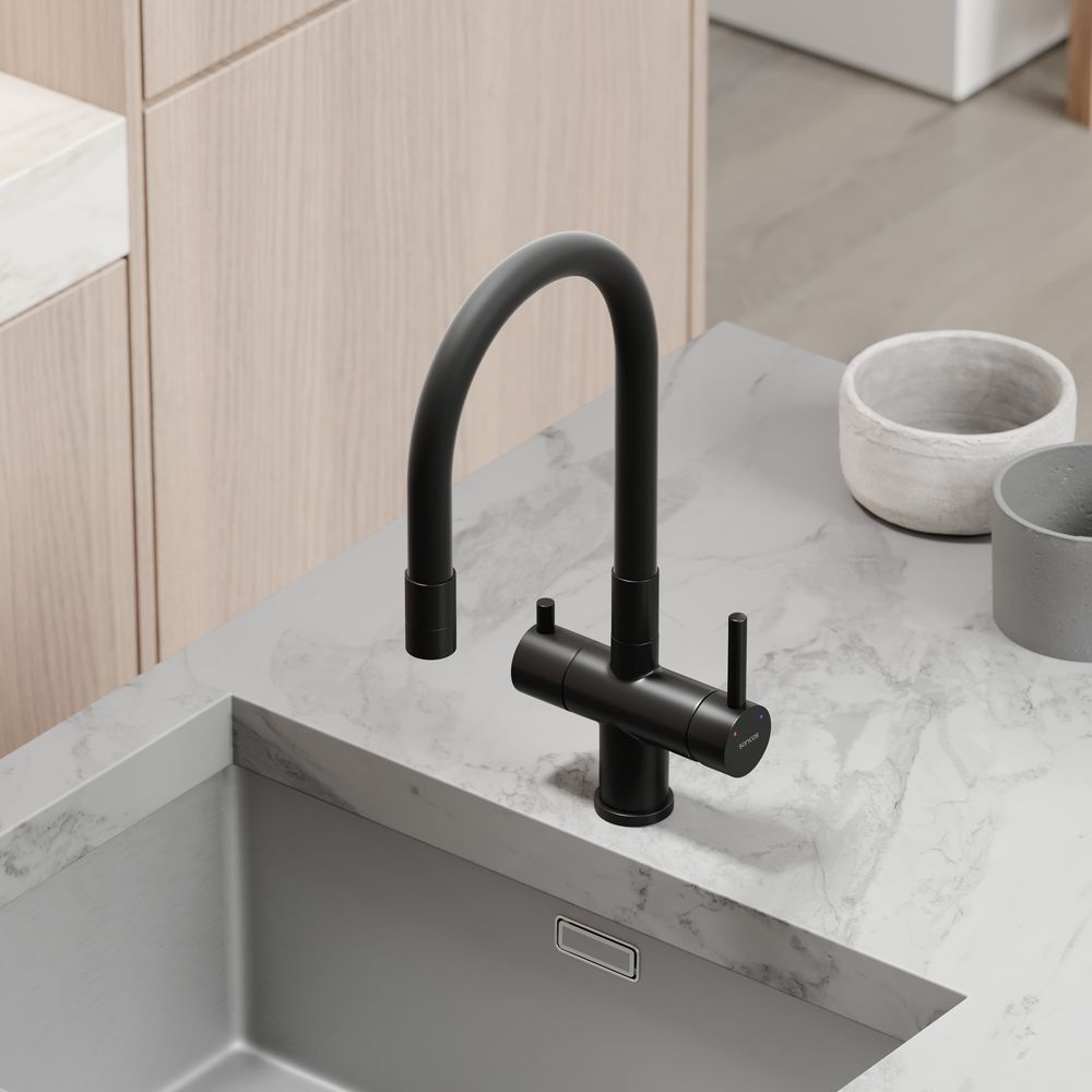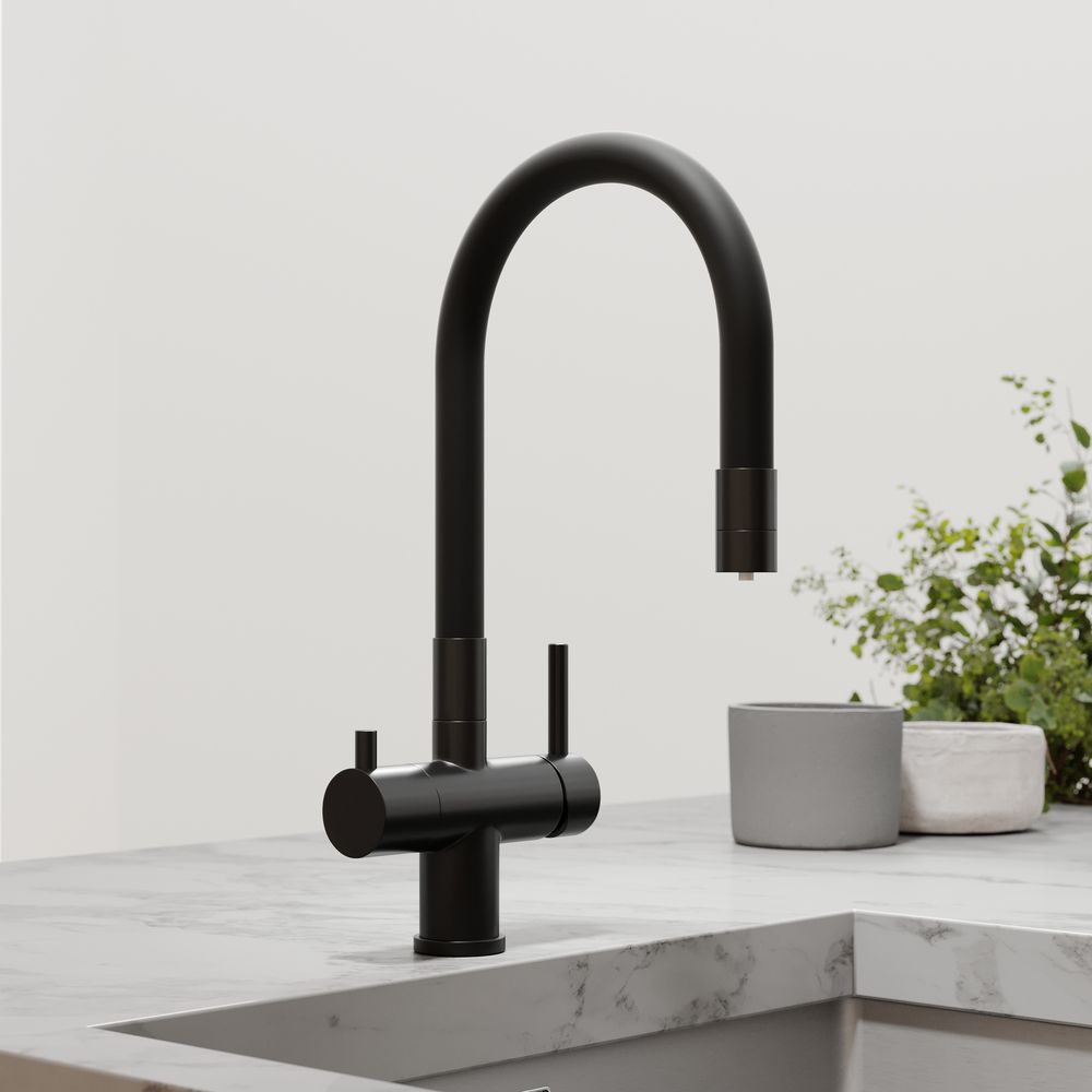 Смеситель для кухни SANCOS Lucia с гибким изливом и возможностью подключения фильтра для воды, цвет матовый черный, арт. SC4004MBС возможностью регулировки температуры водыАэратор, гибкая подводка, ключ и крепления для монтажа