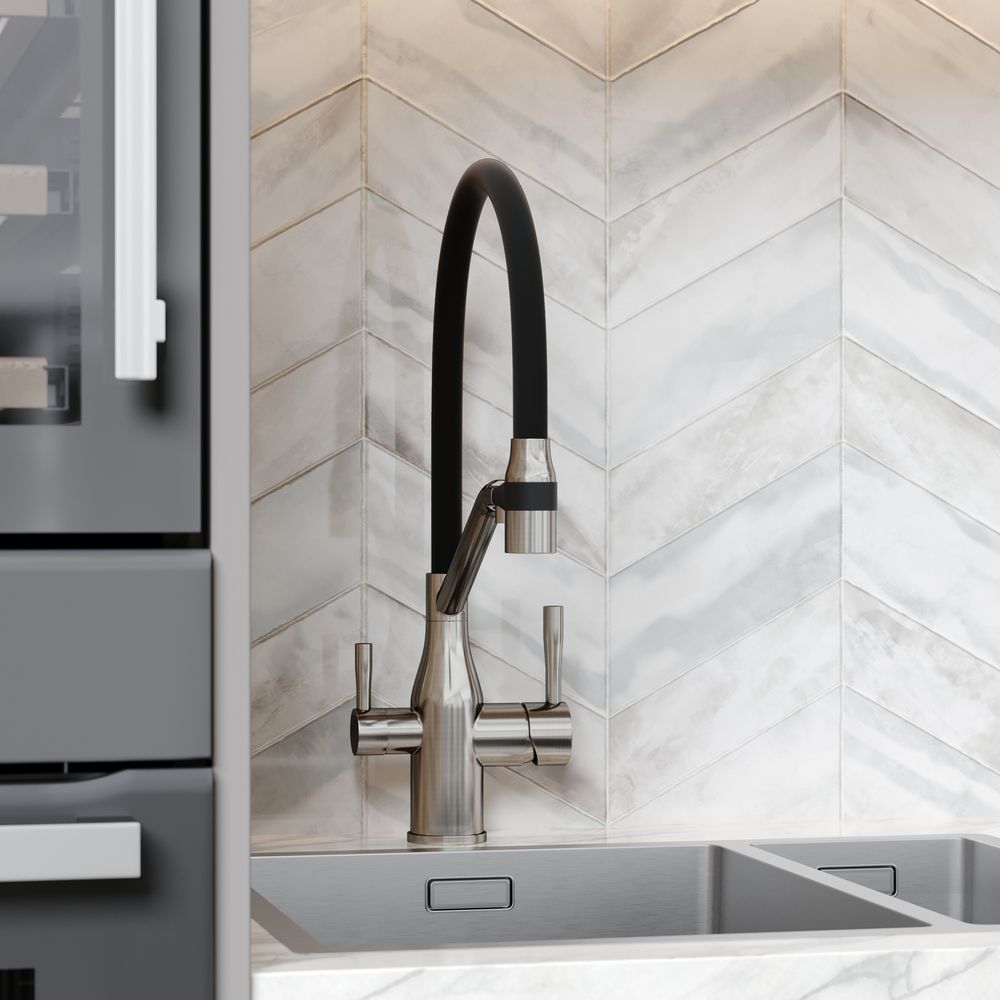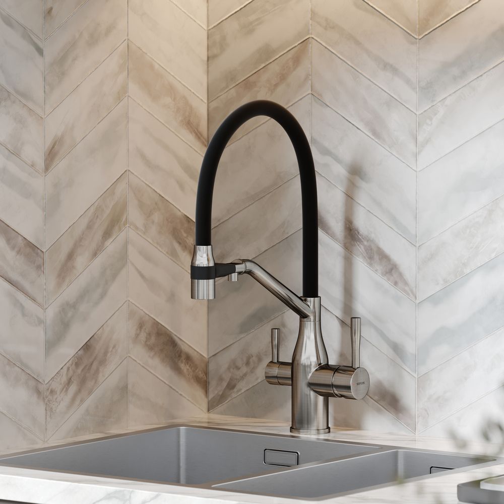 Смеситель для кухни SANCOS Orta с гибким изливом и возможностью подключения фильтра для воды, цвет брашированный никель, арт. SC4008BNФункция "Холодный старт" - при включении смесителя активируется холодной поток, для экономии горячей водыАэратор, гибкая подводка, ключ и крепления для монтажа