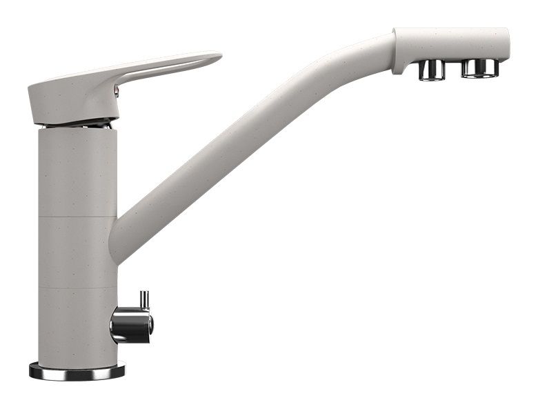 Высокоэргономичный кухонный смеситель с дополнительным краном для подключения фильтрованной воды, оснащенный кран-буксой с керамическими пластинами. Реализован тройной подвод воды через один излив: холодная, горячая и фильтрованная. Переход с одного подвода на другой производится поворотом рычага. Набор для соединения с фильтром входит в комплект. Система фильтрации приобретается дополнительно и монтируется под мойку, специальный индикатор сообщает о необходимости замены картриджа. Материал корпуса выполнен из высококачественной латуни, а окрашивание под искусственный камень в цвет мойки ULGRAN выполняется на собственном производстве, что позволяет идеально попасть в фирменный цвет ULGRAN. В качестве керамического картриджа используется известный бренд Wanhai диаметром 35 мм с высокой пропускной способностью в 500 тысяч циклов открывания-закрывания. На подвижные части картриджа Wanhai нанесена специальная невымываемая силиконовая смазка, а керамические пластины изготовлены из 96 процентов оксида алюминия, что, в сочетании с высоким качеством шлифовки обеспечивает долговечность, надежность, плавность хода рукоятки. Смеситель оборудован съемным пластиковым аэратором для экономии воды и поворотным изливом на 360 градусов. В комплектацию входят: керамический картридж Wanhai, гибкая подводка, комплект крепежных элементов, кран-букса с керамическими пластинами для дополнительного излива для фильтрованной воды, набор для подсоединения фильтра питьевой воды (гибкая подводка + переходник-цанга), технический паспорт и гарантийный талон.Заводская