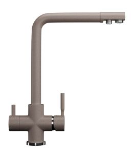 Высокоэргономичный кухонный смеситель с дополнительным краном для подключения фильтрованной воды, оснащенный кран-буксой с керамическими пластинами. Реализован тройной подвод воды через один излив: холодная, горячая и фильтрованная. Переход с одного подвода на другой производится поворотом рычага. Набор для соединения с фильтром входит в комплект. Система фильтрации приобретается дополнительно и монтируется под мойку, специальный индикатор сообщает о необходимости замены картриджа. Материал корпуса выполнен из высококачественной латуни, а окрашивание под искусственный камень в цвет мойки ULGRAN выполняется на собственном производстве, что позволяет идеально попасть в фирменный цвет ULGRAN. В качестве керамического картриджа используется известный бренд Wanhai диаметром 35 мм с высокой пропускной способностью в 500 тысяч циклов открывания-закрывания. На подвижные части картриджа Wanhai нанесена специальная невымываемая силиконовая смазка, а керамические пластины изготовлены из 96 процентов оксида алюминия, что, в сочетании с высоким качеством шлифовки обеспечивает долговечность, надежность, плавность хода рукоятки. Смеситель оборудован съемным пластиковым аэратором для экономии воды и поворотным изливом на 360 градусов. В комплектацию входят: керамический картридж Wanhai, гибкая подводка, комплект крепежных элементов, кран-букса с керамическими пластинами для дополнительного излива для фильтрованной воды, набор для подсоединения фильтра питьевой воды (гибкая подводка + переходник-цанга), технический паспорт и гарантийный талон.