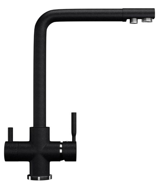 Высокоэргономичный кухонный смеситель с дополнительным краном для подключения фильтрованной воды, оснащенный кран-буксой с керамическими пластинами. Реализован тройной подвод воды через один излив: холодная, горячая и фильтрованная. Переход с одного подвода на другой производится поворотом рычага. Набор для соединения с фильтром входит в комплект. Система фильтрации приобретается дополнительно и монтируется под мойку, специальный индикатор сообщает о необходимости замены картриджа. Материал корпуса выполнен из высококачественной латуни, а окрашивание под искусственный камень в цвет мойки ULGRAN выполняется на собственном производстве, что позволяет идеально попасть в фирменный цвет ULGRAN. В качестве керамического картриджа используется известный бренд Wanhai диаметром 35 мм с высокой пропускной способностью в 500 тысяч циклов открывания-закрывания. На подвижные части картриджа Wanhai нанесена специальная невымываемая силиконовая смазка, а керамические пластины изготовлены из 96 процентов оксида алюминия, что, в сочетании с высоким качеством шлифовки обеспечивает долговечность, надежность, плавность хода рукоятки. Смеситель оборудован съемным пластиковым аэратором для экономии воды и поворотным изливом на 360 градусов. В комплектацию входят: керамический картридж Wanhai, гибкая подводка, комплект крепежных элементов, кран-букса с керамическими пластинами для дополнительного излива для фильтрованной воды, набор для подсоединения фильтра питьевой воды (гибкая подводка + переходник-цанга), технический паспорт и гарантийный талон.