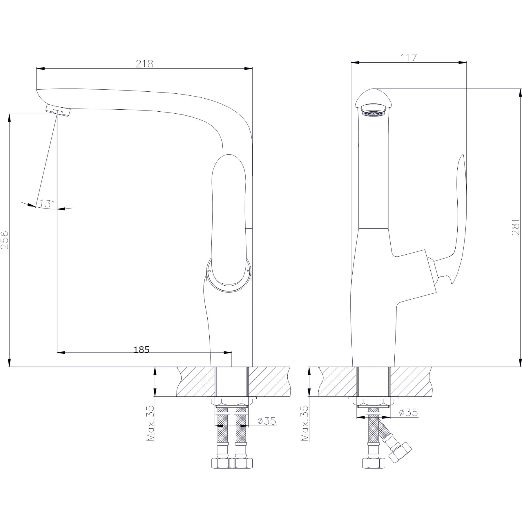 • Высота смесителя: