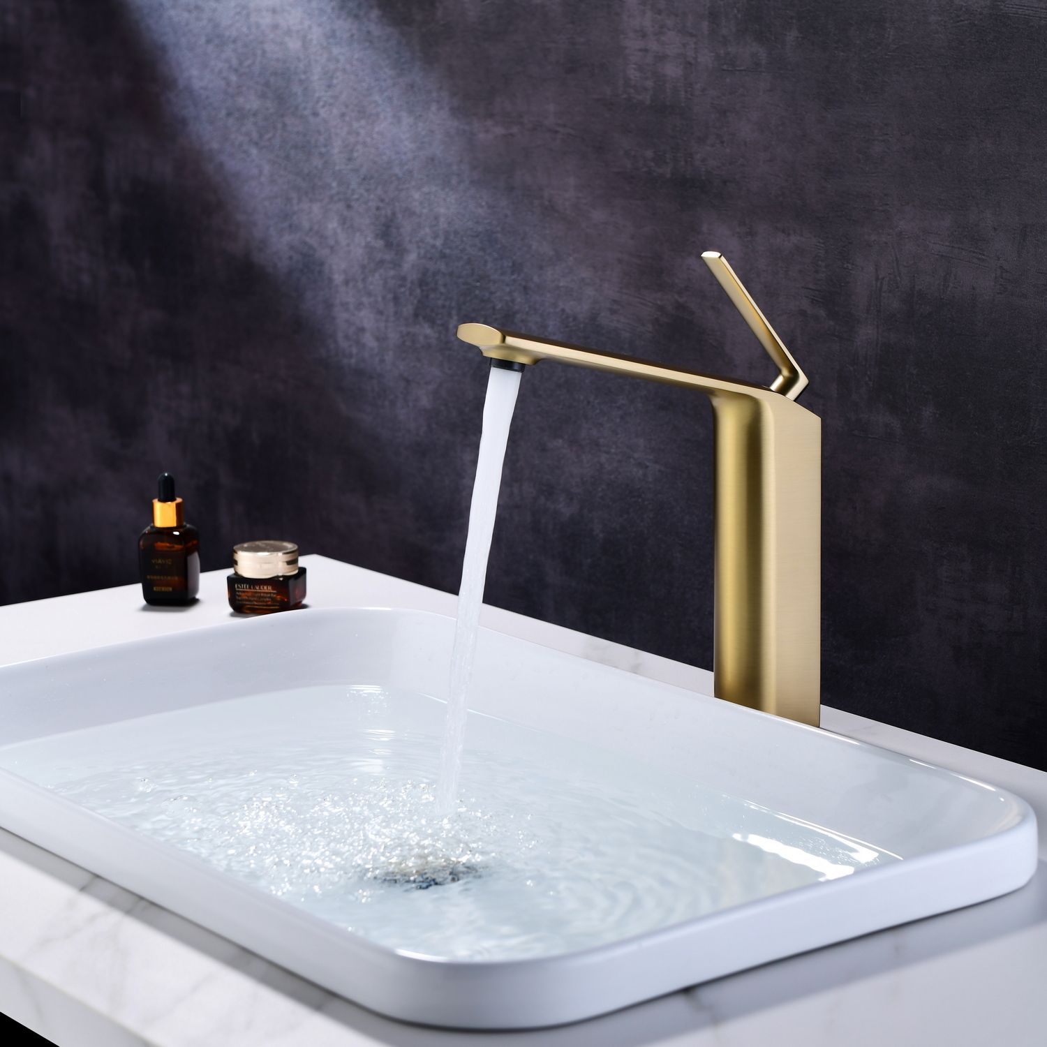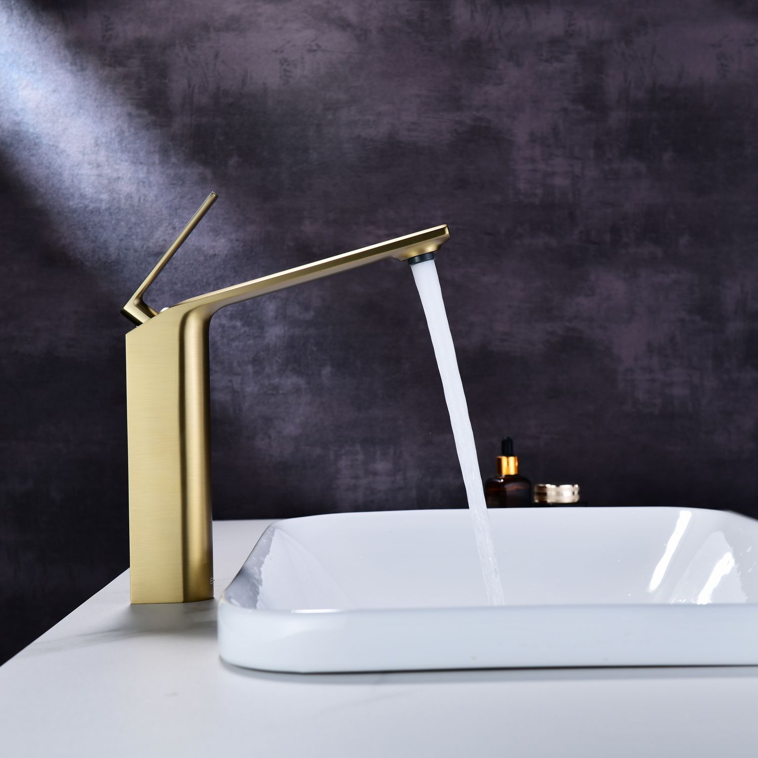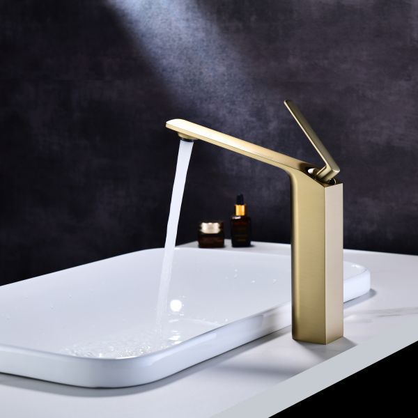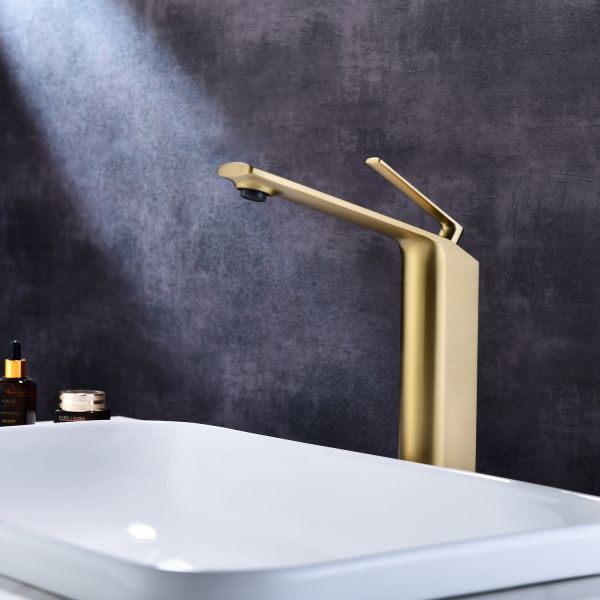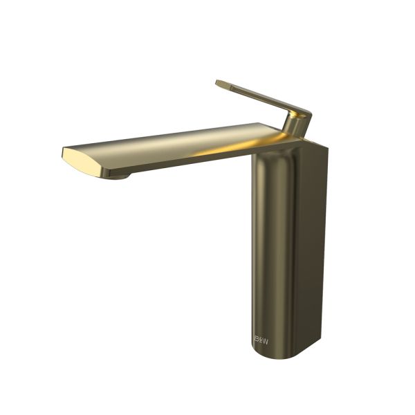 Смеситель для накладной раковины датского производителя Black&White в цвете брашированное золото .Продукт изготовлен из сантехнической латуни – безопасного для здоровья сплава, обработанный  обработанный PWD покрытием. Управление давлением и температурой воды происходит с помощью керамического картриджа повышенной пропускной способности.Высота смесителя составляет 22 см., что оптимально для накладных и полувстраиваемых раковин, а излив с возвышением позволяет комфортно мыть руки и минимизировать количество брызг.