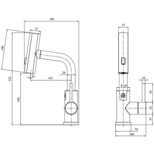 Смеситель для раковины датского производителя Black&White в цвете оружейная сталь. В корпусе изделия прослеживаются нотки классических форм и современного стиля. Изготавливается из сантехнической латуни для увеличенного запаса прочности и исключения вероятности появление коррозии. Управление потоком воды осуществляется с помощью керамического картриджа повышенной пропускной способности. Инновационным решением можно отметить электронное табло, расположенное в нижней части корпуса, на которое выводится показание температуры воды с подсветкой красного, зеленого и синего цвета. В данном продукте реализован многофункциональный излив с возможностью настройки длинны с помощью вытяжного шланга. Аэратор смесителя оборудован несколькими видами подачи воды, которые переключаются с помощью кнопки расположенной сверху корпуса.
